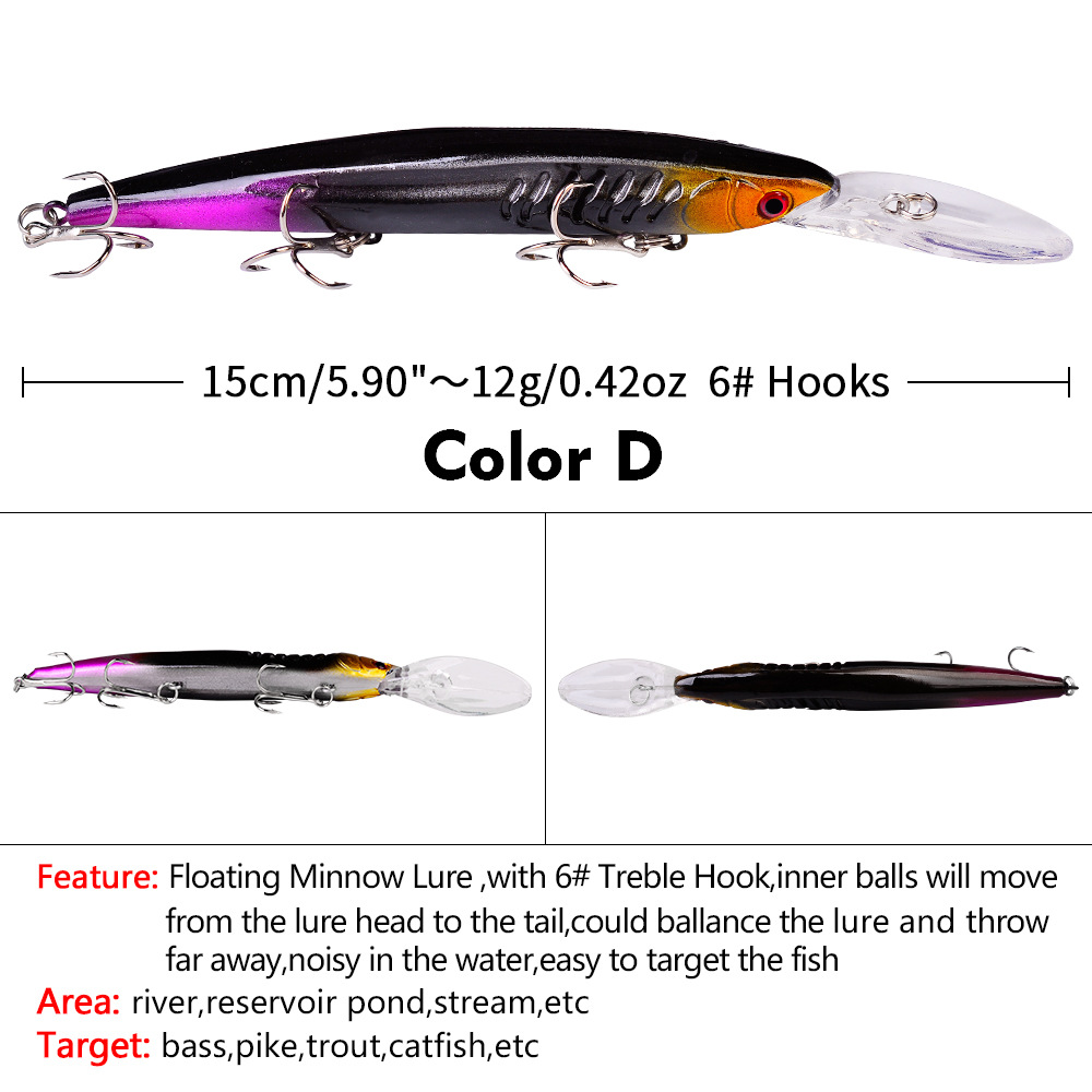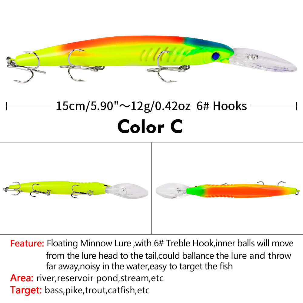 TheYEZIXIN Floating Minnow Lure (Model DW1302)is a high-performance freshwater hard bait engineered for targeting trophy bass and other aggressive predatory fish.Measuring 15.2cm in length and weighing 12.55g, this lure combines a streamlined realistic body with professional core technologies—including a center of gravity transfer system and internal rattling steel balls.It dives to 1.6–3.2 meters, delivers ultra-long casting distance, and produces lifelike swimming motions plus enticing underwater sounds, making it unbeatable for lakes, rivers, and reservoirs.With 6 vibrant color options and durable ABS construction, it’s ideal for both recreational anglers and tackle wholesalers.