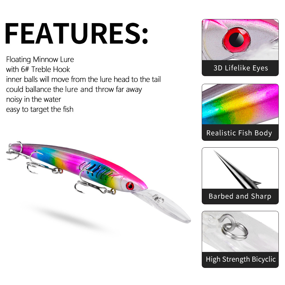 - 360° Light Reflection& Rattling Attraction: Holographic realistic body reflects light from all angles for water clarity adaptability; internal steel beads produce loud, natural sounds to draw fish from afar.
