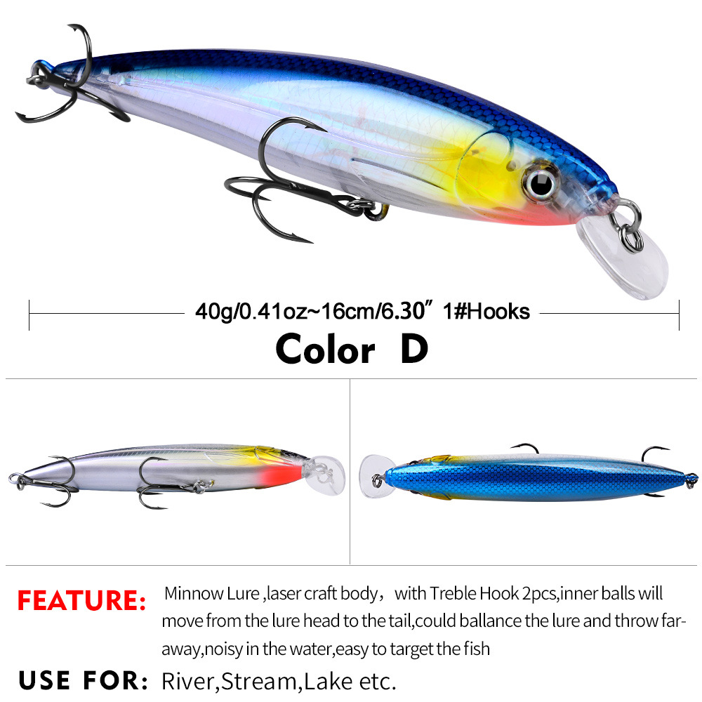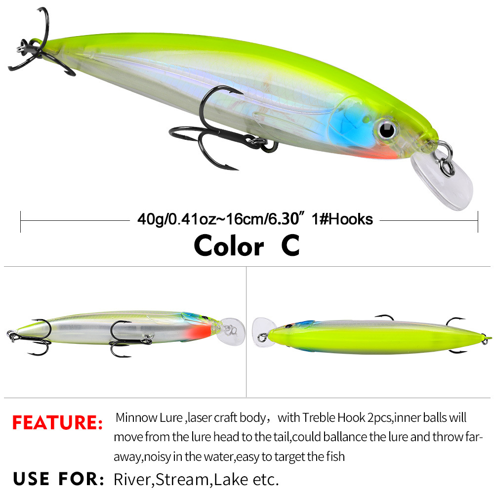 TheYEZIXIN Floating& Suspending Minnow Lure (Model DW567)is a premium heavy-duty hard bait built for anglers chasing trophy predatory fish.Measuring 16cm in length and weighing 40g, this large-profile lure combines a hyper-realistic bionic design, laser skin finish, andprecision internal ball system to deliver unmatched performance.It supports three core actions—floating (F), sinking (S), and suspending (SP)—including the classic "Dog Walking" surface technique, perfectly mimicking the erratic movements of injured baitfish.Equipped with ultra-strong#1 black treble hooks and packaged in individual OPP bags for protection, it’s ideal for targeting giant culter, pike, musky, and big bass in freshwater lakes, rivers, and coastal saltwater areas.